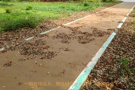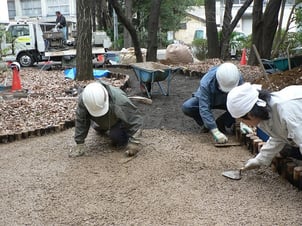 大規模工事でのウッドチップ舗装の課題として、資材を集めて施工を実施することは技術的に可能なのですが、練りこみコテ仕上げでは人件費が高く、また人手不足の折施工が実現しないなどの事例があり、技術普及の妨げとなっています。